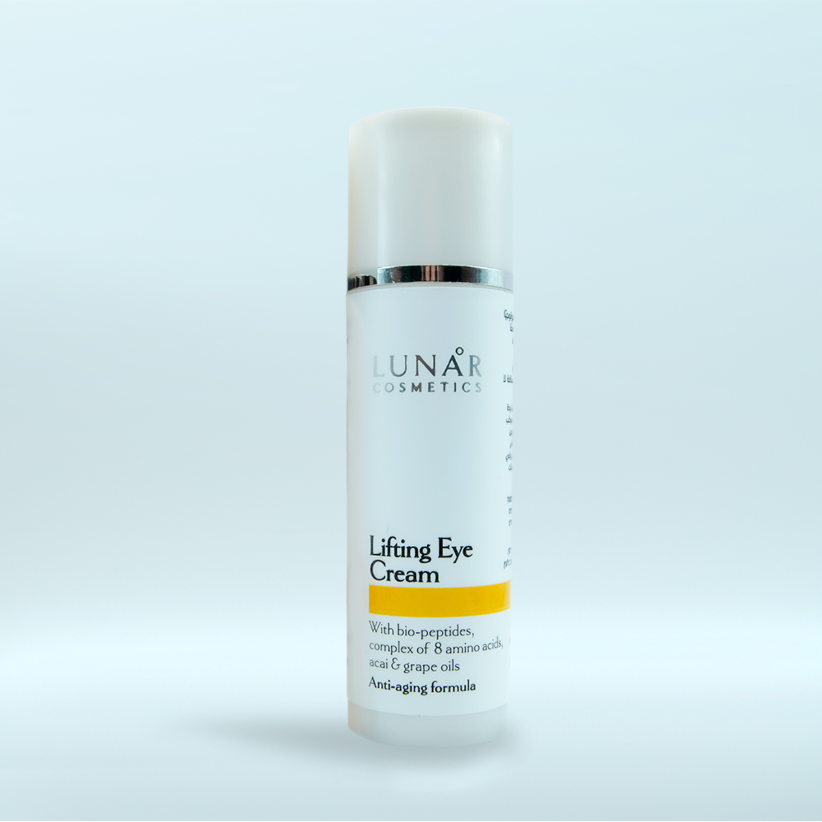 Lifting eye cream reduces under-eye bags, dark circles, and enhances skin elasticity with bioactive peptides, acai oil, and minerals.